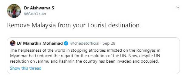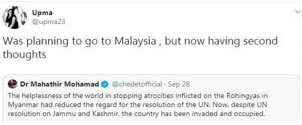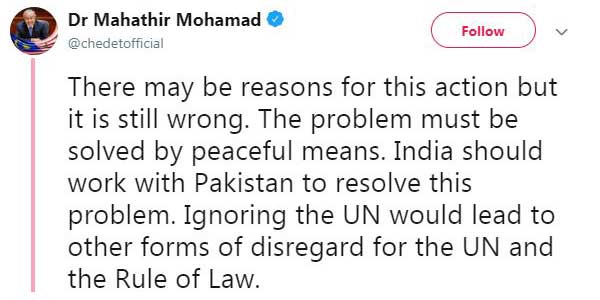 मलेशियाई पीएम महातिर मोहम्मद ने शनिवार को संयुक्त राष्ट्र में अपने भाषण दिया। इसके बाद उन्होंने उससे जुड़े कई ट्वीट किए, जिसमे से एक कश्मीर को लेकर था। कश्मीर का जिक्र करते हुए उन्होंने ट्वीट किया कि दुनिया म्यांमार में रोहिंग्याओं पर हो रहे अत्याचारों को रोकने में नाकाम रही, जिसके कारण यूएन रेजॉलूशन के सम्मान में कमी आई है। अब, जम्मू और कश्मीर पर यूएन रेजॉलूशन के बाद भी, देश (भारत) ने इस पर जबरन कब्जा जमा लिया है।