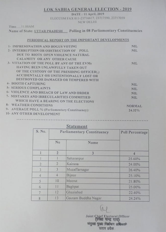 11:15 AM- 11 बजे तक उत्तर प्रदेश के मेरठ में 25.4 प्रतिशत, बिजनौर में 24.9 प्रतिशत, सहारनपुर में 26 प्रतिशत, मुज़फ्फरनगर में 27.2 प्रतिशत, बागपत में 26 प्रतिशत और कैराना में 25.8 प्रतिशत मतदान हुआ।