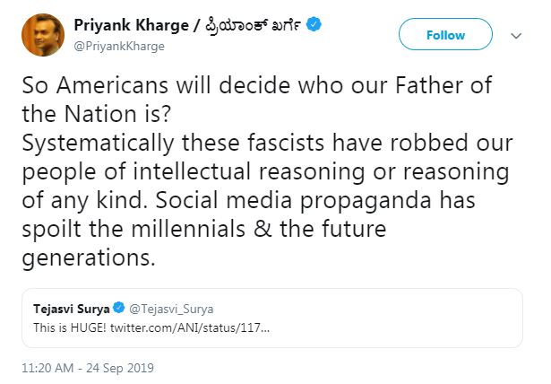 दरअसल, कांग्रेस नेता मल्लिकार्जुन खड़गे के बेटे और कर्नाटक सरकार में मंत्री रहे प्रियांक खड़गे ने ट्वीट करते हुए लिखा कि क्या अब अमेरिकी ये तय करेंगे हमारे राष्ट्रपिता कौन हैं? उन्होंने आगे लिखा कि इन फासीवादी लोगों ने हमारे लोगों को बौद्धिक रूप से तर्क देकर लूटा है। उन्होंने कहा कि सोशल मीडिया के प्रोपेगेंडा ने मिलकर आने वाली पीढ़ियों को बिगाड़ दिया है।
