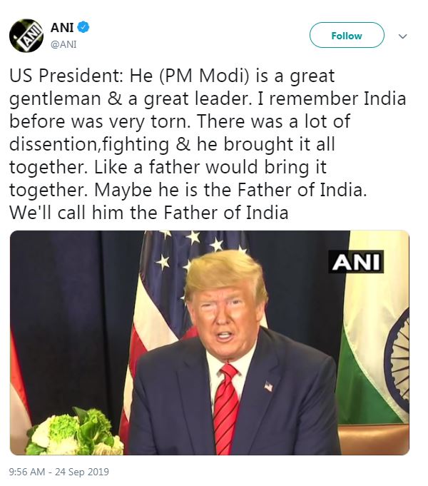 दरअसल, मंगलवार को जब अमेरिकी में ट्रंप ने प्रधानमंत्री नरेंद्र मोदी के साथ प्रेस कॉन्फ्रेंस की तो तब उन्होंने पीएम मोदी की खूब तारीफ की। इस दौरान उन्होंने कहा कि पहले भारत को याद किया जाए तो पहले वहां लोग लड़ते रहते थे, लेकिन, पीएम मोदी ने सभी लोगों को एक साथ लाने के काम किया है। एक पिता की तरह वह सभी को साथ लेकर आए। शायद वो फादर ऑफ इंडिया हैं, हम उन्हें फादर ऑफ इंडिया ही बुलाएंगे। लोगों को एक साथ लाना अच्छा काम है और पीएम मोजी ने ये काम बहुत अच्छे से किया है।